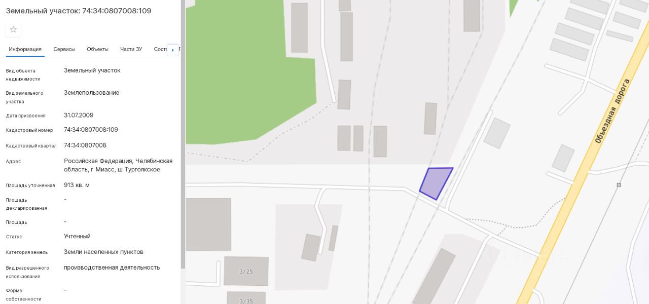 Данные получены с сайта ГИС Торги.Земельный участок с кадастровым номером 74:34:0807008:109, с разрешенным использованием производственная деятельность, расположенный по адресу: Челябинская обл., г. Миасс, ш. Тургоякское, общей площадью 913 кв.м., из земель населенных пунктов, сроков на 30 месяцев