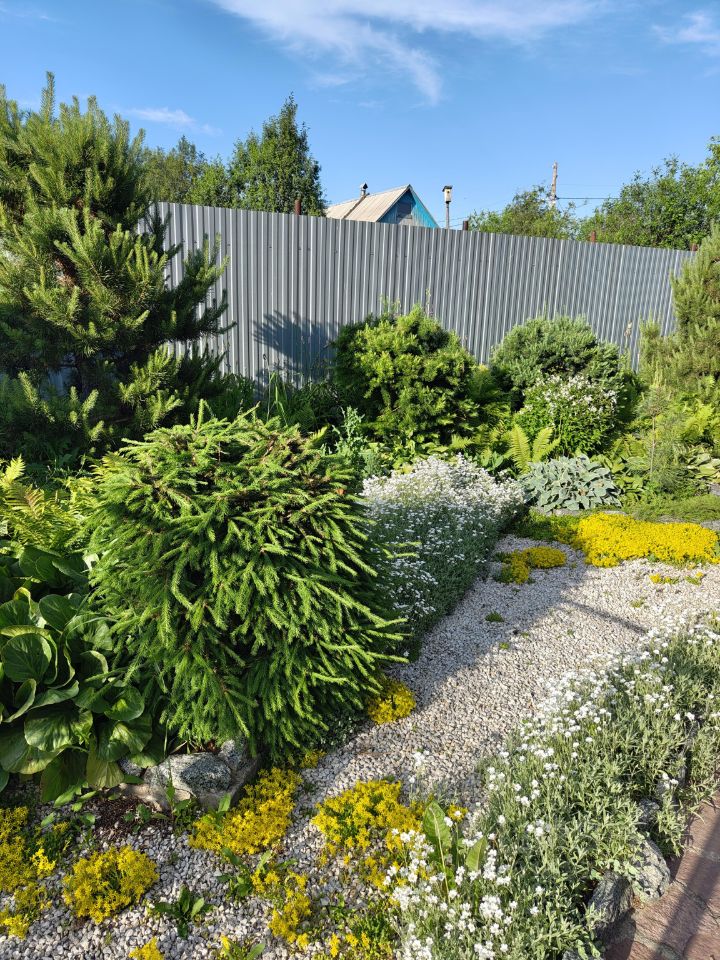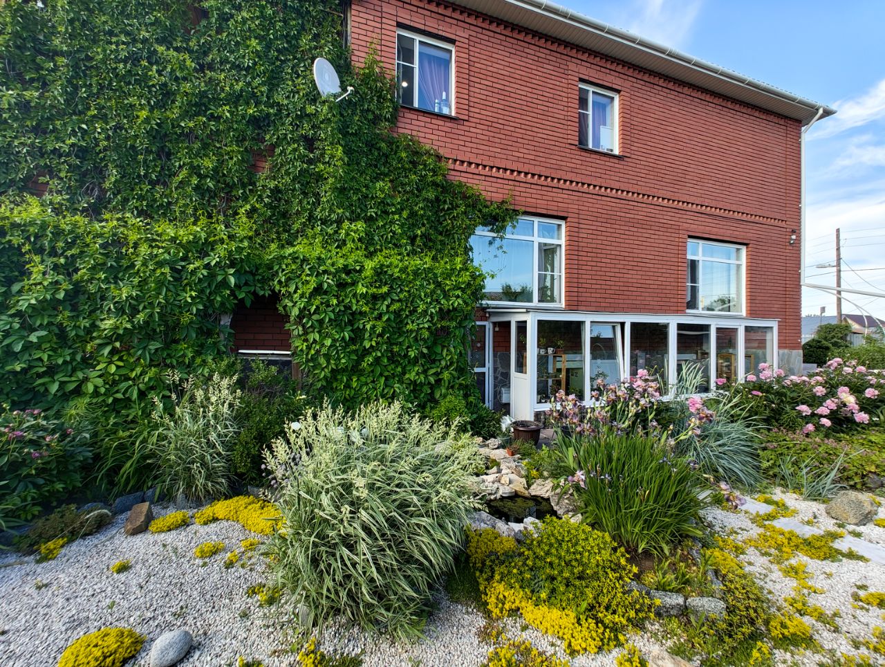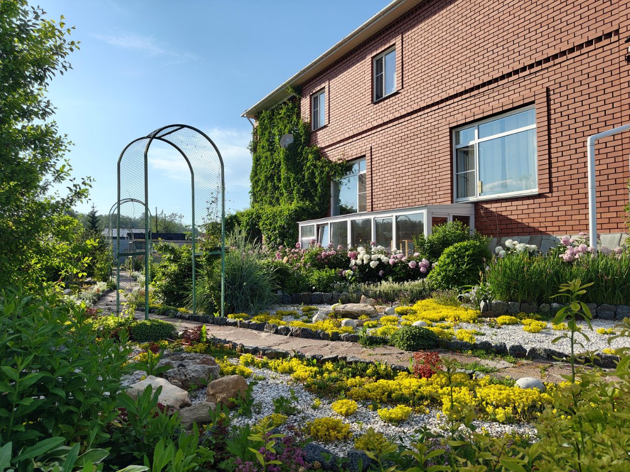 Сад ухоженный, с более чем 200 видами растений, включая фруктовые деревья и кустарники.