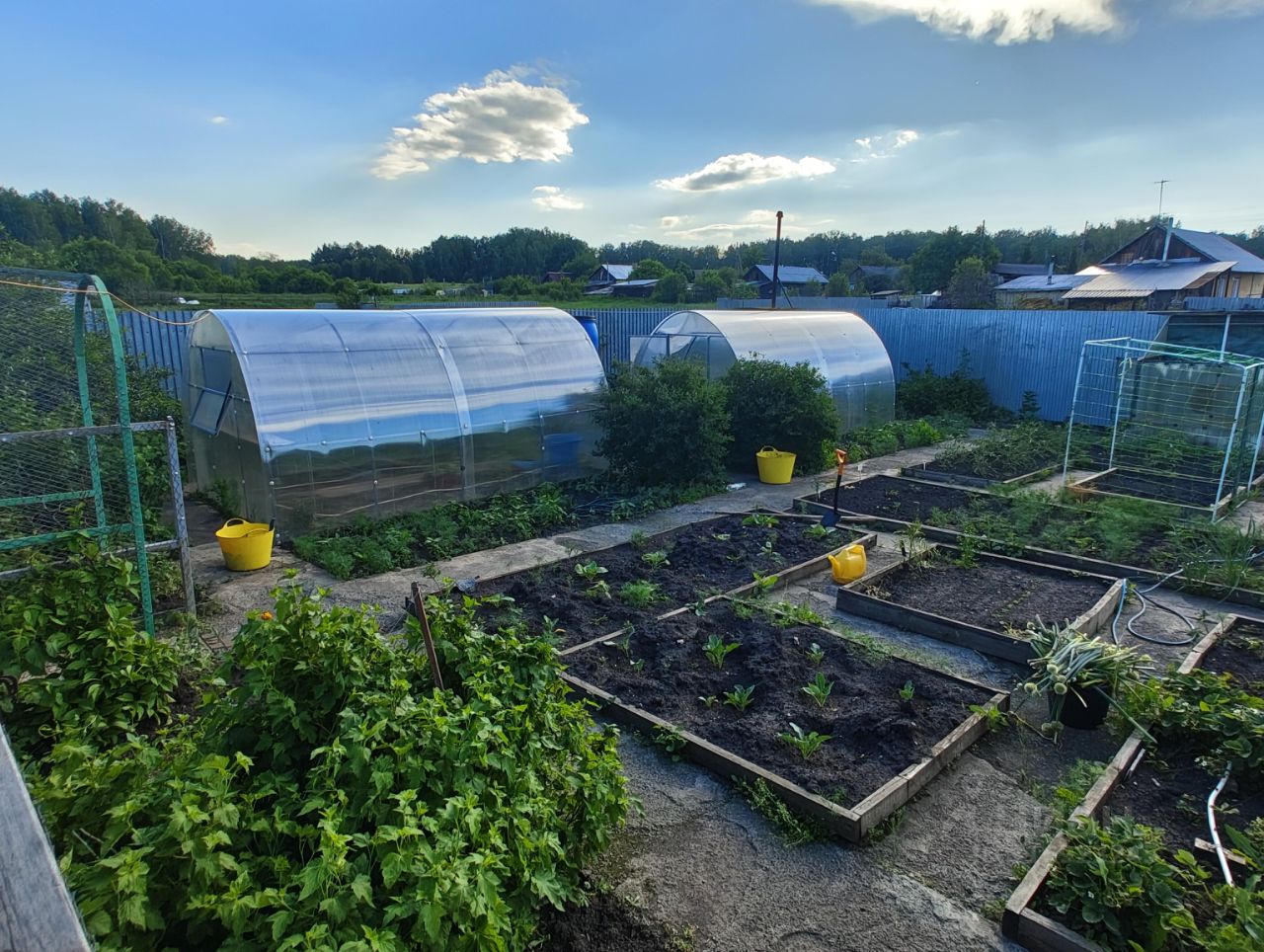 • Огород с бетонными дорожками и две теплицы.