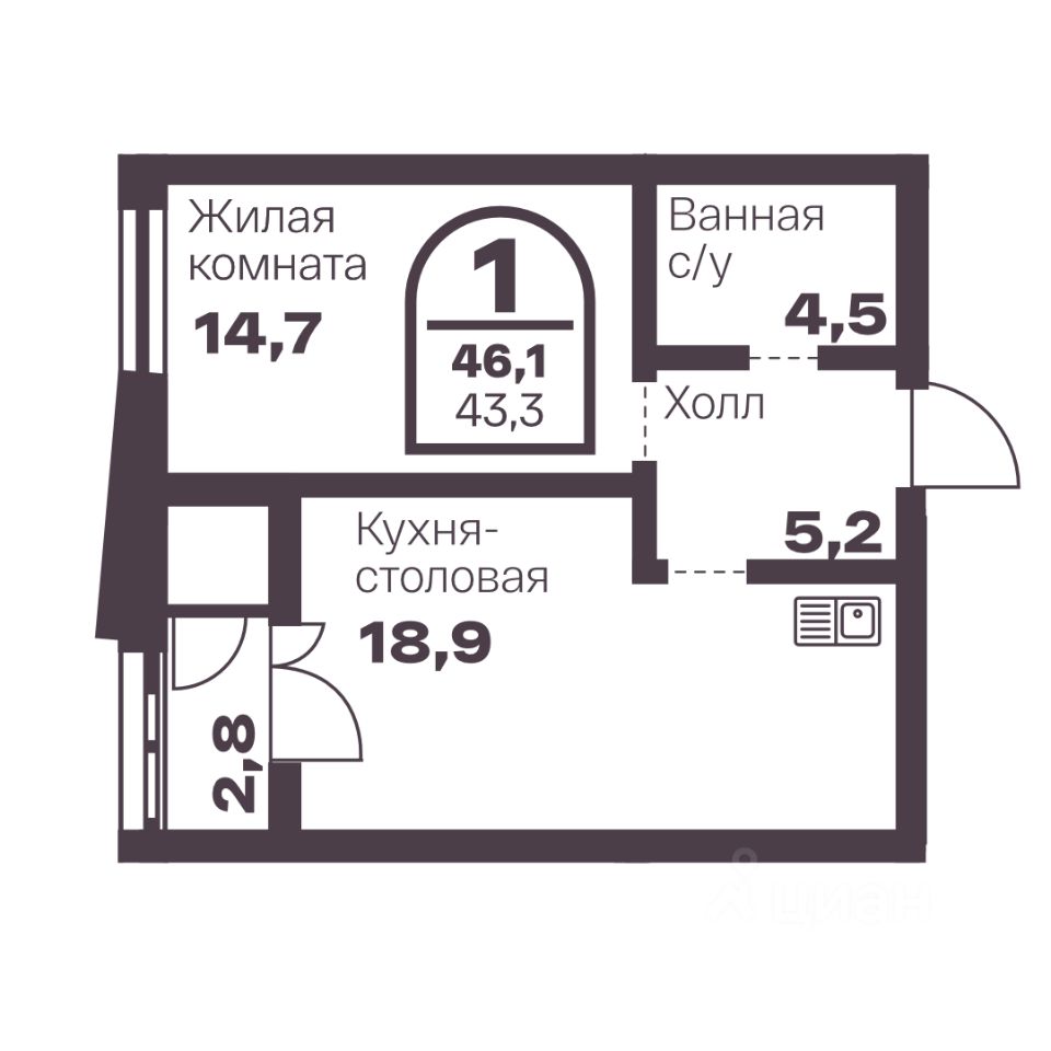Общая площадь43,3 м2