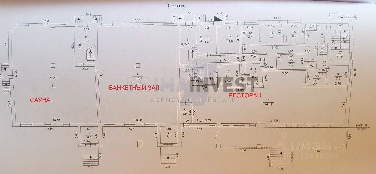 площадь подвала- 318 м.2, 1 этаж- 650 м.2, второй этаж- 697 м.2