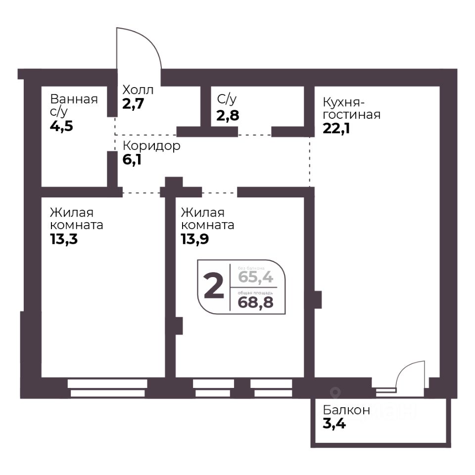 Общая площадь65,4 м2