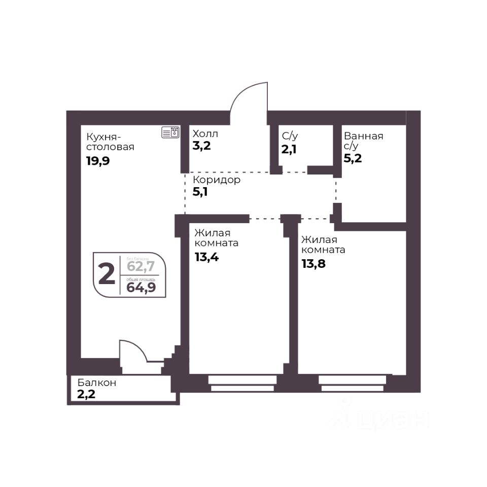 Общая площадь62,7 м2