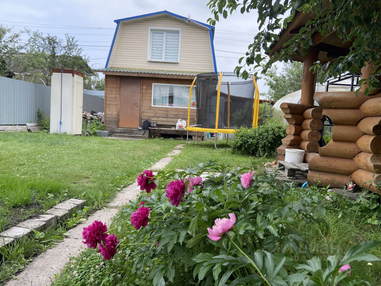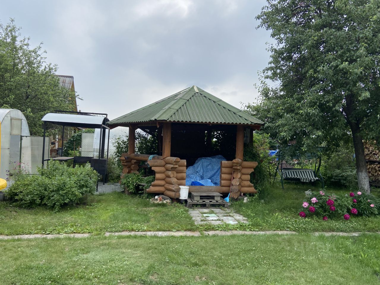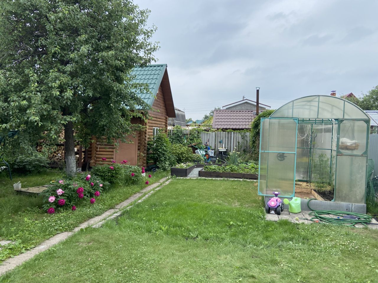 Площадь участка 397 кв.м (4 сотки), теплый дом с верандой, бытовое помещение для хранения инструмента, новая баня, брусовая беседка, мангальная зона, 2 теплицы, скважина 20 метров, парковка под 1 автомобиль, дровник, раковина, летний водопровод, летний душ с электроподогревом, туалет, территория обнесена забором, грядки оформлены досками, большая часть территории засеяна газоном.