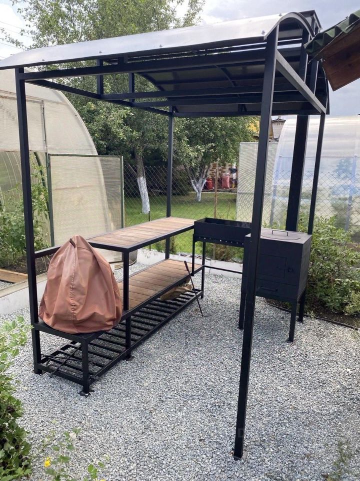 Мангальная зона новая, установлена летом 2024 года, была изготовлена на заказ, выполнена из металла, в мангальной зоне есть мангал, печь под казан, подставка под тандыр, стол для готовки.
