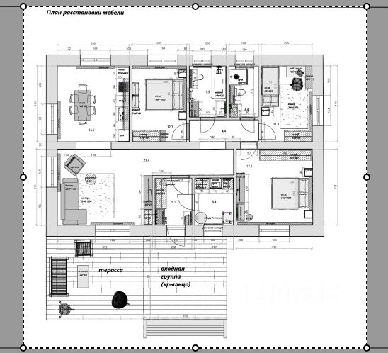 Планировка дома по проекту: Котельная площадью - 7м.кв. , прихожая площадью - 8м.кв., 3 санузла, 3 спальни площадью - 13,16 и 18м.кв., кухня гостиная - 48м.кв.