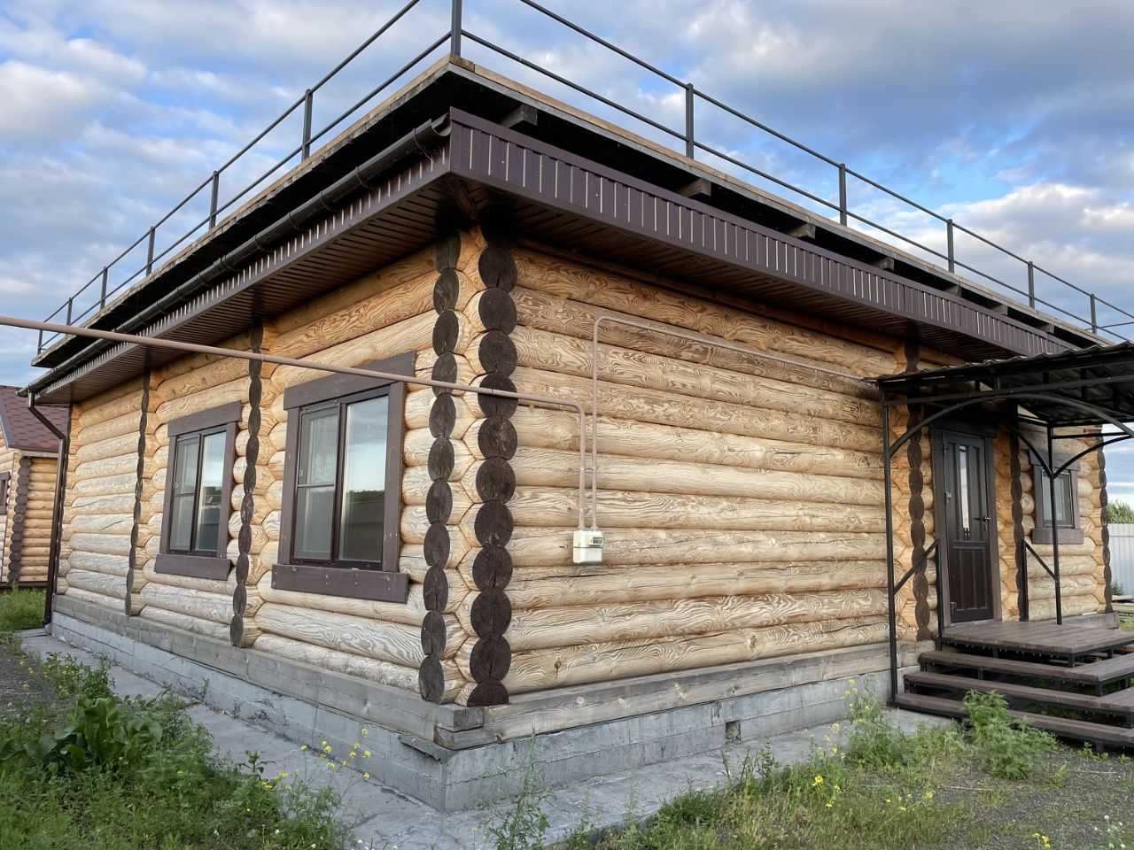 Дом 10*10 м. из цилиндрованного бревна диаметром 300 мм. Фундамент - свайно-ростверковый. Крыша - прямая, терраса. Панорамное окно на кухне. Студия + 3 комнаты. В доме газ, центральная вода, электричество 380 Вт., канализация - септик 5 кубов. Частично установлены мебель и бытовая техника. На участке расположена баня 4,5*4,5 м. из цилиндрованного бревна 220 мм. с отоплением и санузлом. Территория огорожена профнастилом, фасадная часть - евроштакетником. Ворота - откатные электрические. Имеется видеонаблюдение.