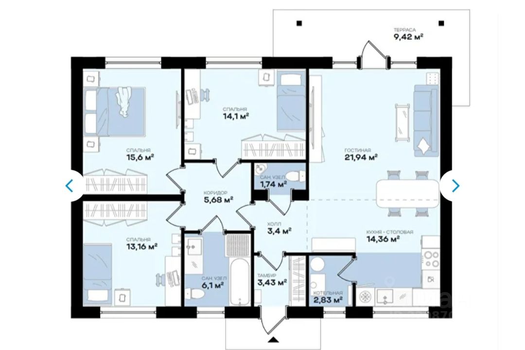 Три спальных комнаты площадью 13,16 м², 14,1 м², 15,6 м²,