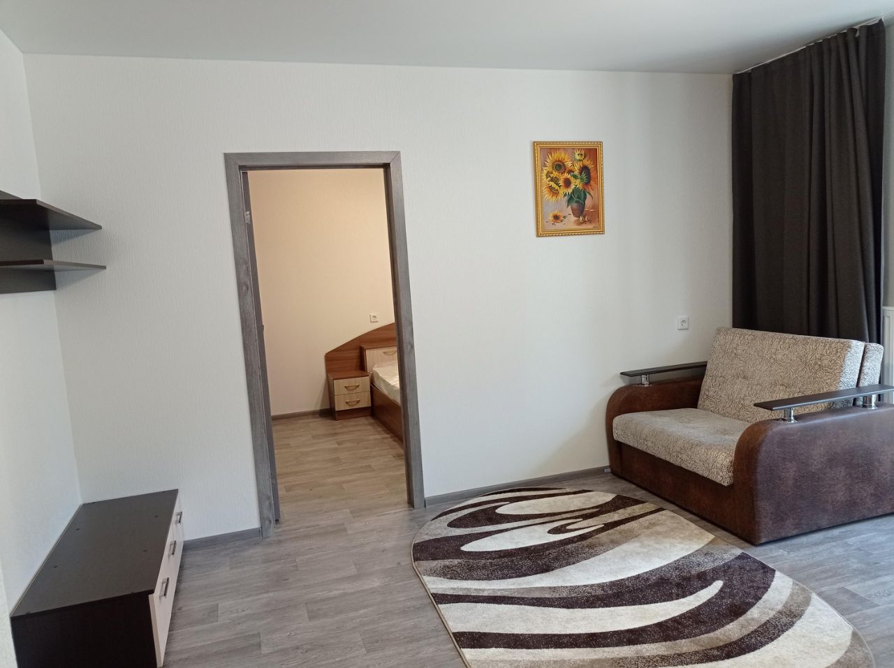 Квартира оборудована необходимой мебелью и бытовой техникой. Спальные места: двуспальная кровать в спальне + односпальный диван в зале.