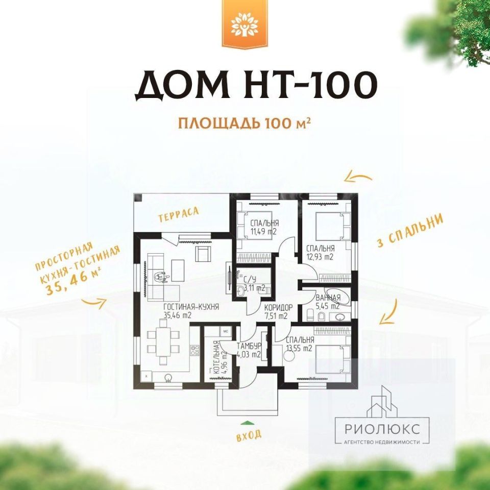 Площадь дома - 108 м В этом доме есть всё для комфортного проживания: - 3 отдельные спальни (11,49 м, 12,9 м, 13,5 м) - просторная кухня-гостиная с выходом на задний двор (35,4 м) - терраса площадью 12 м - все коммуникации уже подведены. Живя в этом доме, вы по достоинству оцените просторную кухню-гостиную с выходом на задний двор. Графитово-серая крыша придаёт этому дому ещё более привлекательный вид. Ламинация окон выполнена также в цвет крыши. Рекомендуем посмотреть эти дома лично, потому что фотография не передаёт всех тех приятных ощущений, что вызывает этот дом!