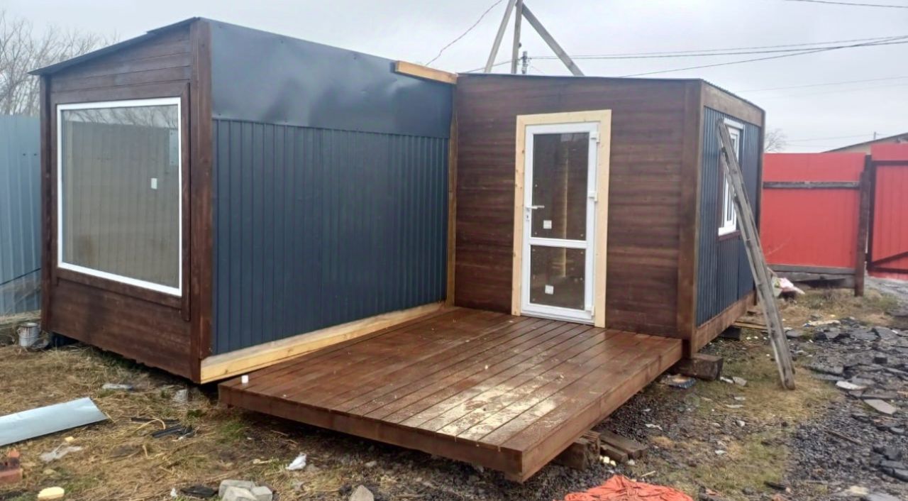 Арт. 115383744 Дом 28м2 с верандой. Без места, можем установить на вашем участке. высота потолка 2.3 метра Ширина 2.2 м Высота 2.3м Длина 4.8 Сан узел высота 2.3 Ширина 2.2 Длина 0.9 Полностью каркас 40, 50х100. Доска 100мм. Утеплитель 100мм, каменная вата.