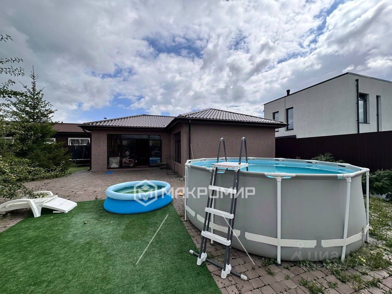 Участок в 10 соток уже обустроен для семейной жизни: детская площадка, место под бассейн, сад с плодовыми деревьями и цветниками.