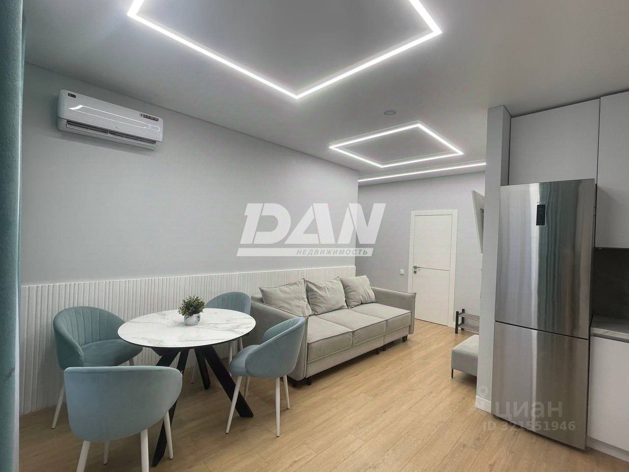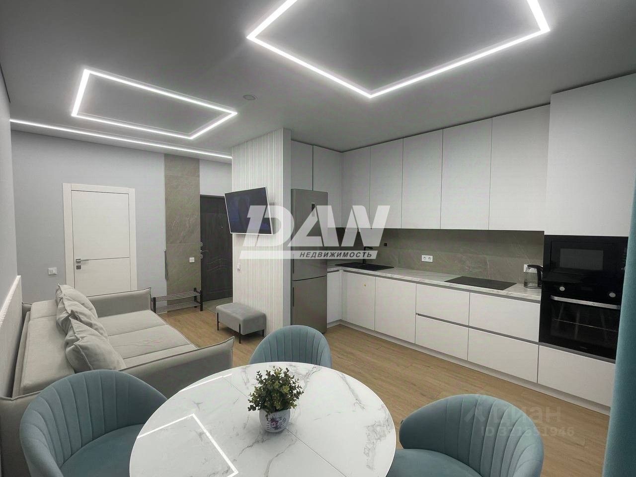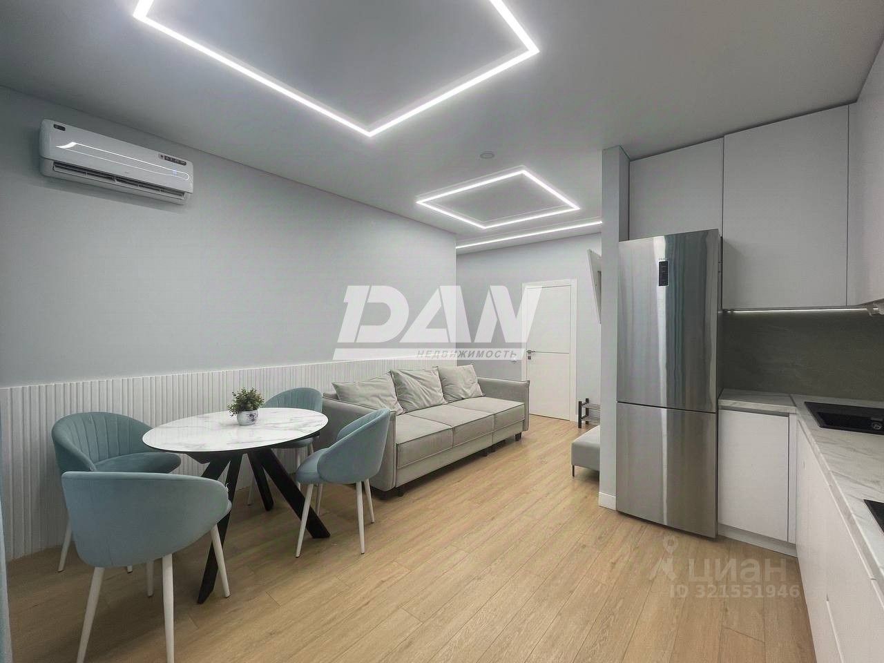 В кухне-гостиной новый кухонный гарнитур со встроенной бытовой техникой, есть кондиционер. Ремонт выполнен в 2024 году по проекту дизайнера, по принципам Васту, для гармоничного проживания всей семьи.