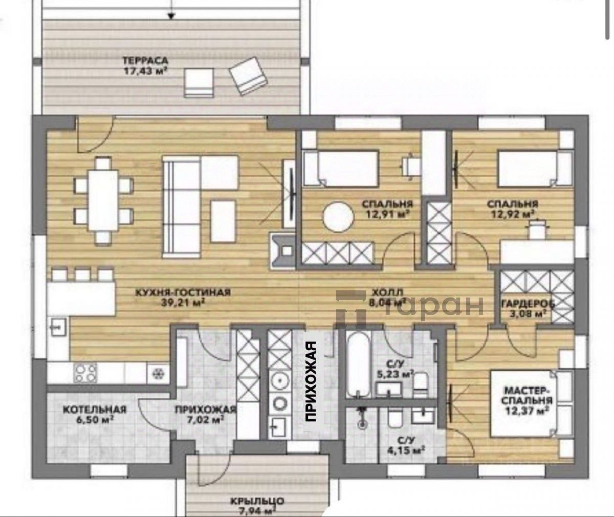 Здесь не будет проблем с фундаментом, вентиляцией или крышей — потому что всё продумано заранее. Планировка — современная, удобная, с изюминкой: • Просторная кухня-гостиная с выходом на террасу и участок • 3 спальни, одна из которых — мастер-спальня с собственным санузлом и гардеробной • Большой общий санузел + бойлерная • Высокие потолки 4,3 метра — просторно, светло, легко дышится!