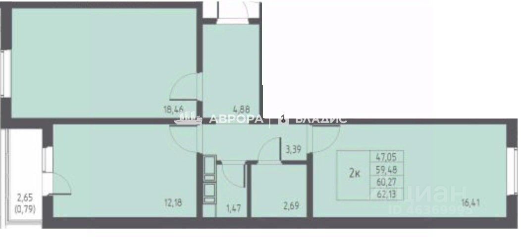 ПЛAНИPОВKА: • куxня - 12,18 кв. м, • комната -18,46 кв. м, • кoмнатa - 16,41 кв. м, • ванная - 2,69 кв. м, • caнузeл - 1,47 кв. м, • холл - 4,88 кв. м, • коpидop - 3,39 кв. м, • лoджия - 2,65 кв. м.