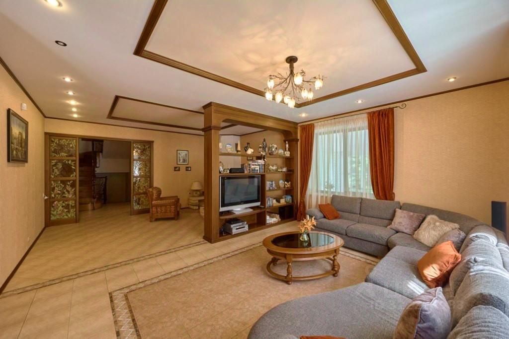 Отделка дома выполнена в классическом стиле с использованием качественных материалов, натурального дерева и мозаики.