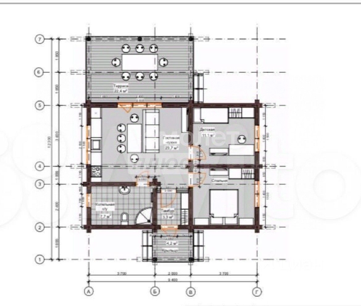 Планировка: Кухня-гостиная с выходом на террасу Две автономные спальни Санузел Котельная