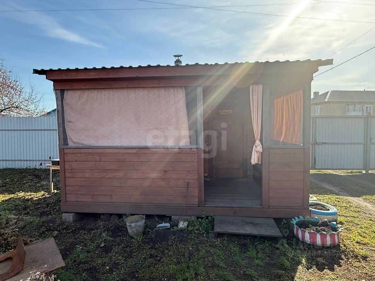 Подъезд - асфальтированная дорога. Земельный участок 11, 27 соток. Огорожен с одной стороны сеткой, с другой деревянным забором, центральная часть, выходящая на улицу, - профнастилом. Ворота тоже из профнастила. Есть новая баня с террасой размером 8х5. Капитальный сарай из шпал. Курятник. Две теплицы из поликарбоната. На участке растут виноград, яблоня, малина, вишня, терн, клубника, многолетние цветы. Полное сопровождение по сделке.