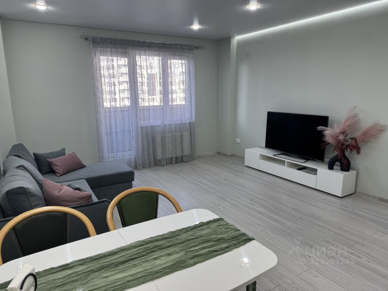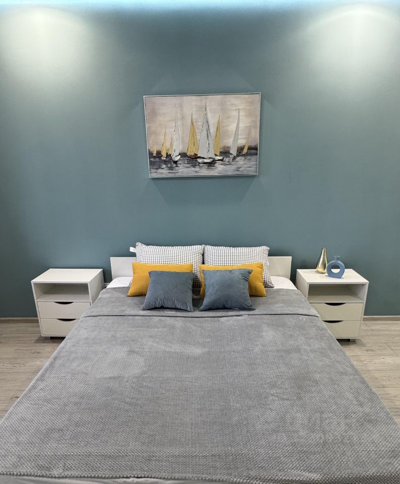 Вся мебель и техника новая: стиральная машина, холодильник, плита, духовка, телевизор, электрический полотенцесушитель. Из мебели - кухонный гарнитур, обеденный стол, диван, кровать и все тумбы - все новое, еще никто не пользовался.