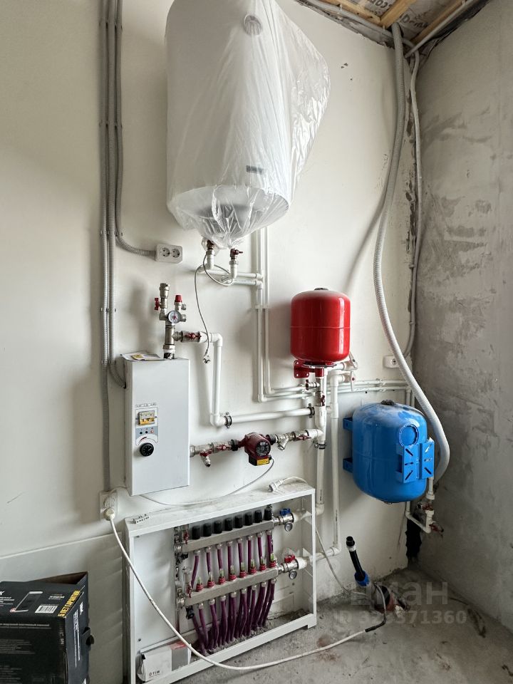 Котельная смонтирована в полной комплектации с 3х фазным электро-котлом 12 кВт, расширительными баками, насосами на каждую группу, бак на водоподготовку 50л, водонагреватель на 80 литров. Выполнены выводы для подключения газового котла. Сеть горячей и холодной воды разведена согласно проекту.