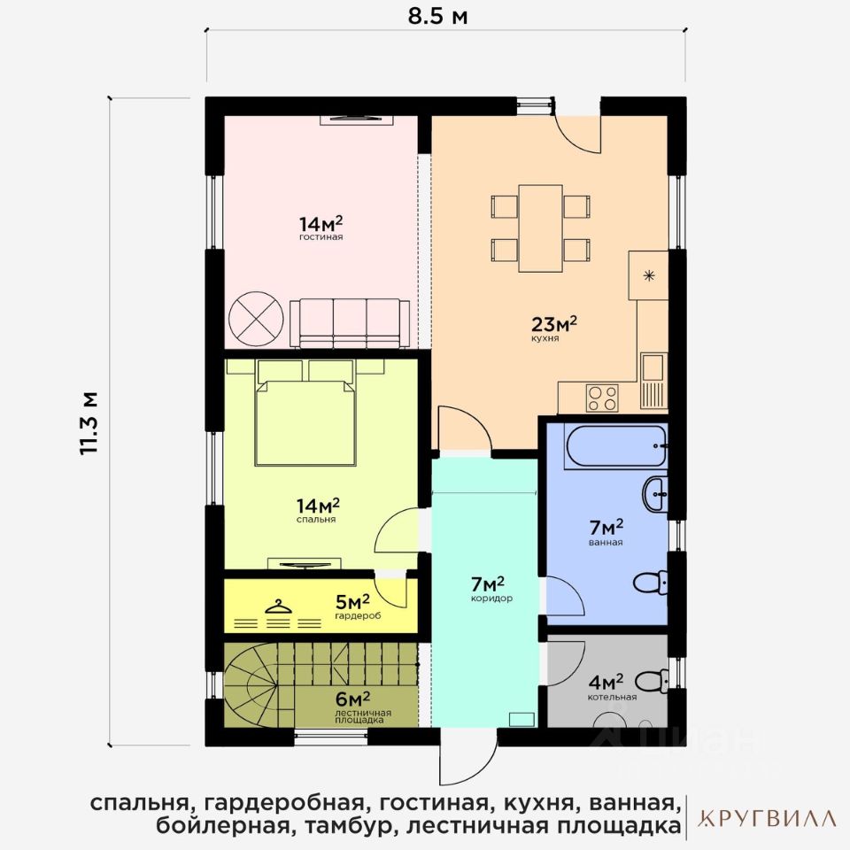 1 этаж: бойлерная, большая ванная, спальня + гардероб, гостиная, кухня (80 кв.м.)