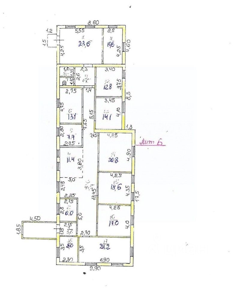 • 15 помещений, высота потолков — 3,5 м