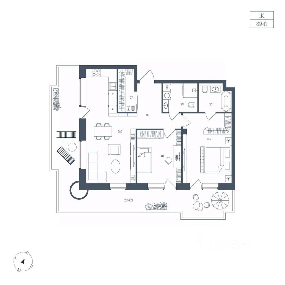 Общая площадь89,41 м2