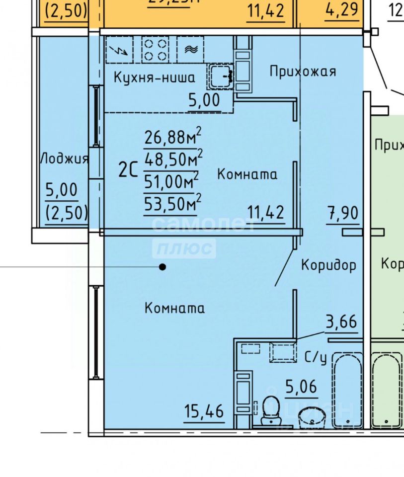 Квартира полностью меблирована и оборудована для комфортного проживания! + Кухонный гарнитур угловой, холодильник, обеденный стол, 4 стула в зоне кухни + в гостиной 11,42 кв.м. стоит диван раскладной, телевизор, кондиционер + Двуспальная кровать в спальне + Коридор просторный состоит из 2 зон 7,9 кв.м. и 3,6 кв.м., 2 шкафа! + Санузел совмещён 5 кв.м. установлена стиральная машина, полочки, крючки
