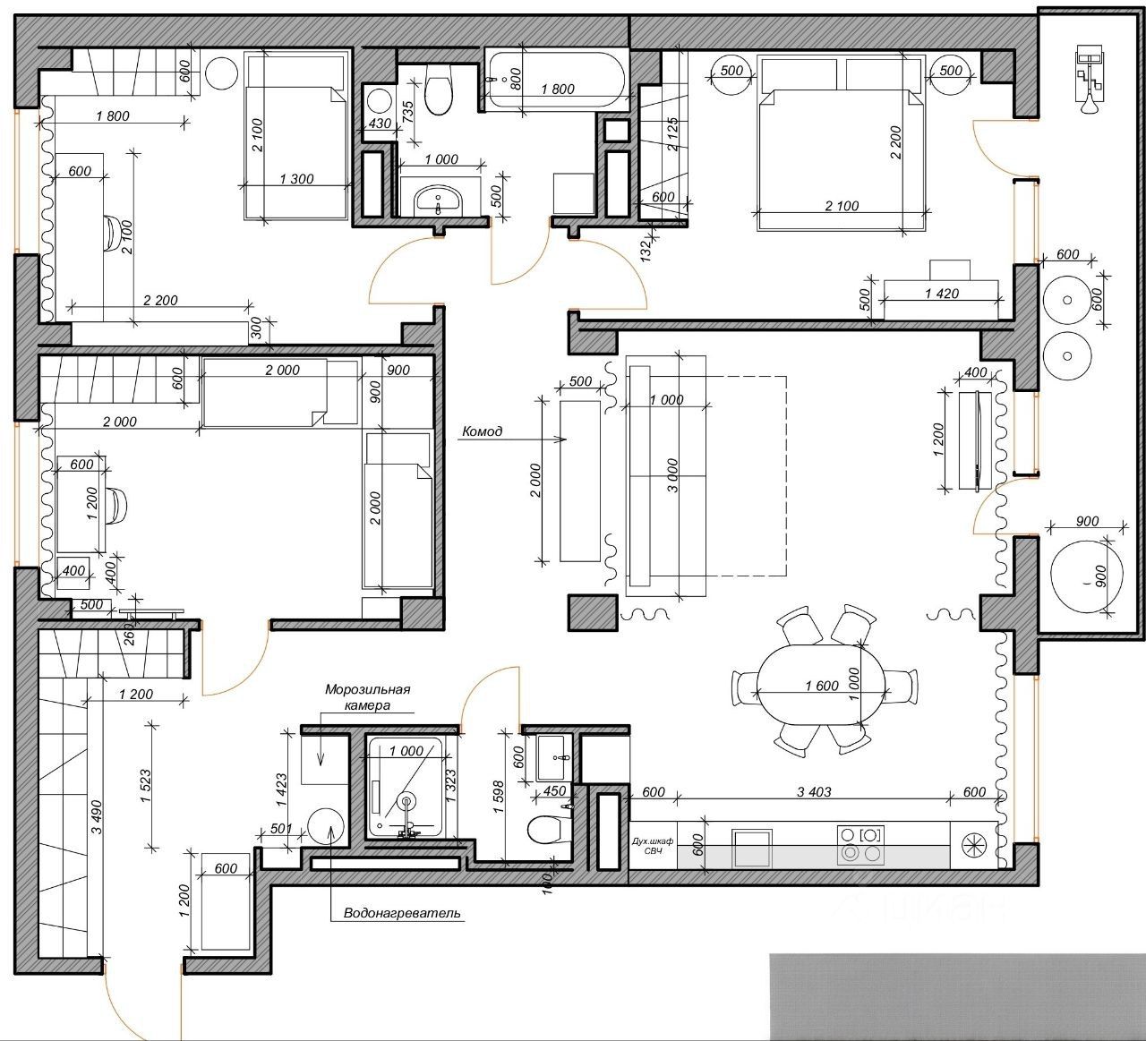 На кухне установлена современная бытовая техника, включая 2 встроенных холодильника и посудомоечную машину и высококачественная каменная столешница .