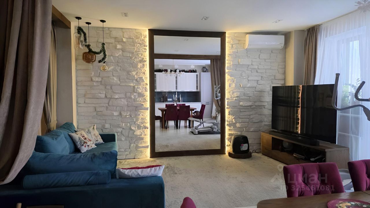 Просторная гостиная оформлена стильными элементами декора: огромное зеркало с рамой дерево-натуральный шпон, с несколькими режимами атмосферной подсветки , крупный-декоративный камень, деревянные балки с отделкой из натурального шпона создающими уютную атмосферу.