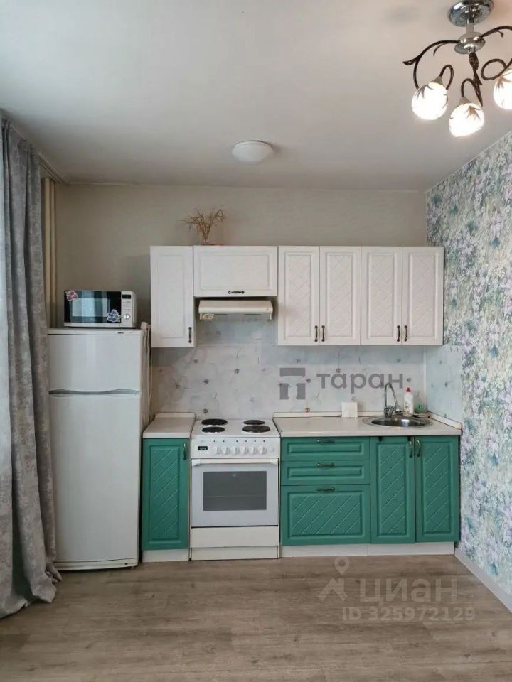 Диван, шкаф как гардеробная, в спальне диван, обеденный стол, в кухне кухонный гарнитур с плитой и раковиной, холодильник+ микроволновка, чайник, обеденная зона у дивана и несколько табуретов.
